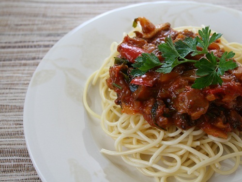 4) Отвариваем пасту, я выбрала спагетти. Обязательно следовать инструкциям и сварить al dente, то есть слегка недоварить. Сервируем тарелку с пастой и соусом. Украшаем листиком зелени и свеженатертым твердым сыром.