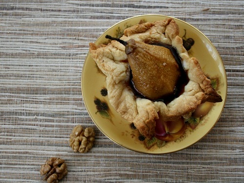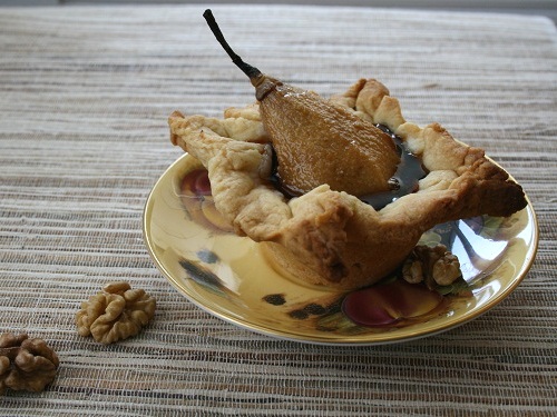 Итак, застилаем тесто в углубления формы. В серединку укладываем грушу. Расправляем края. Отправляем в духовку на 30 минут.