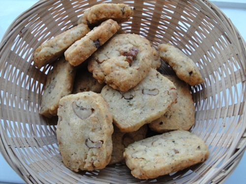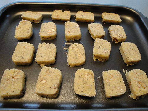 В одной большой чашке соединить муку, орехи, соль, перец и розмарин. В другой взбить размягченное сливочное масло до пышности, добавить сыр и продолжать взбивать на маленькой скорости. Потом добавить подготовленные сухие компоненты. Готовое тесто разделить на две колбаски, каждую завернуть в пленку и отправить на несколько часов в холодильник.