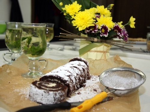 После выпечки переворачиваем корж на лист пекарской бумаги, присыпанный сахарной пудрой. Аккуратно снимаем верхний слой бумаги и накрываем чистым кухонным полотенцем. Бисквит должен остыть, но он останется мягким и его легко будет свернуть.
