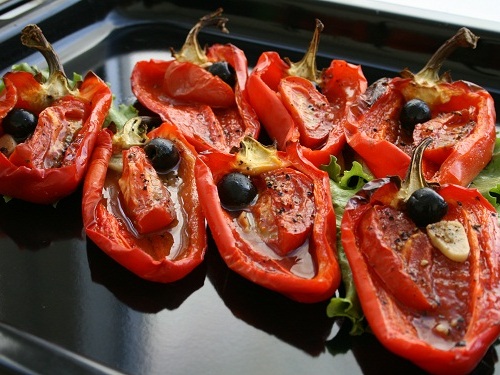 Перцы моем, аккуратно разрезаем вдоль, вычищаем семена и укладываем на противень. Внутрь каждого кладем дольку помидора, чеснок. Солим, перчим, сбрызгиваем растительным маслом и ставим в разогретую до 200С духовку на 15–20 минут. Когда перцы остынут — подаем к столу. Можно покрошить на перцы козий сыр или зелень.