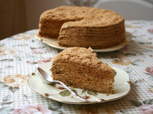 Дайте ему остыть и раскатайте коржи. Обычно получается 8–10 тонких коржей. Выпекайте каждый в течении 10 минут при температуре 200С.