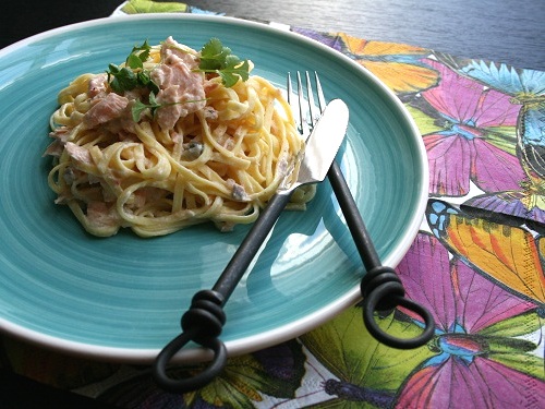 Остывшую семгу разделываем на небольшие кусочки, полностью чистим при этом от косточек, кожицы. Кладем в кастрюлю вместе с каперсами и сливками. Доводим до кипения. Можно на этом этапе дополнительно подсолить и поперчить. Сервируем с пастой. Украшаем зеленью и тертым твердым сыром.