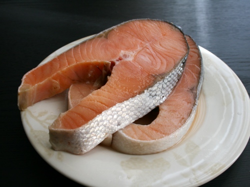 В кастрюлю с толстыми стенками кладем кусочки семги, лавровый лист, лимон и заливаем водой (уровень воды — только чтобы покрыть рыбу, около 2х чашек). Доводим до кипения и держим несколько минут с одной и другой стороны, чтобы семга стала нежной, бледно розовой. Не передержите! Солим и перчим. Вынимаем рыбу на тарелку, а рыбный бульон собираем в отдельную емкость.