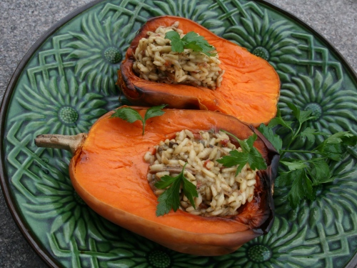 А теперь сам рецепт. Тыковку разрезаем вдоль, вычищаем семена, кладем на противень и в духовку, разогретую до 190С, на 50–60 минут. Пока она не станет мягкой. Подавать в такой тыкве можно любые каши — особенно рисовую или пшенную на молоке (и с сухофруктами!)))), тушеные грибы или мясо. А мне было вкусно с ризотто.