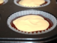 Теперь самое интересное — формируем сами кексы. В каждое углубление формы обязательно поставить бумажный стаканчик. Затем равномерно распределяем шоколадное тесто по формочкам, в центр каждой формочки выкладываем творожно-сырную массу.