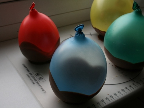 Шарики нужно лишь немного надуть. Посмотрите на основание шарика — его размер и будет глубиной шоколадной чашечки. Шарики моем, и хорошо сушим. Шоколад не должен контактировать с водой. Готовим отрез фольги.