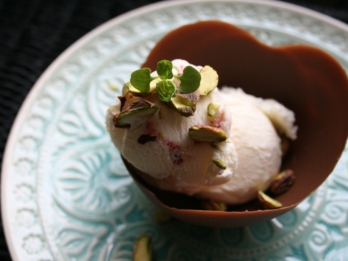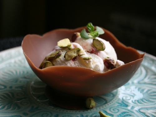 Далее делаем небольшой надрез наверху шарика, чтобы воздух постепенно вышел, аккуратно освобождаем чашечку. Перекладываем её на тарелку. Теперь в каждую чашечку кладем 2 шарика мороженого. Посыпаем орешками, украшаем ягодами или мятой.