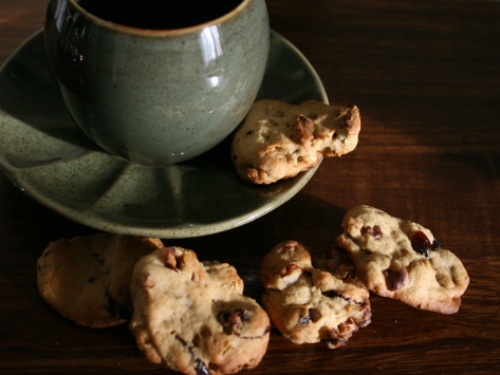 Взбить масло сахаром до пышного состояния, затем взбить с яйцами, ванилью и солью. Постепенно ввести муку, просеянную с пекарским порошком. Наконец, добавить клюкву и орехи. Тесто лолучится вязким.