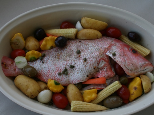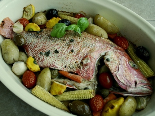 Рыбу солим и перчим, обмазываем оливковым маслом, размещаем в жаростойкое блюдо или на противень. Внутрь укладываем лавровый лист, посыпаем каперсами. Подготавливаем гарнир: режем на несколько частей картошку, лук и со всеми остальными овощами смешиваем в миске, солим, поливаем оливковым маслом, выкладываем вокруг рыбы вместе с оливками. Ставим в заранее разогретую до 180С духовку на 30–40 минут, в зависимости от размеров рыбы. Как только готова, сразу же подаем на стол.