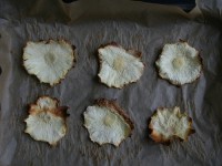 Ананас чистим, моем. С помошью ножа или ложки нужно удалить все «глазки» на поверхности. Тонко (макс. 3 мм) нарезаем, выкладываем на противень, простеленный пекарской бумагой. Ставим в заранее разогретую до 100–100С духовку, на режим с обдувом, сушим 30 минут, затем переворачиваем, сушим еще 30 минут.
