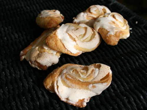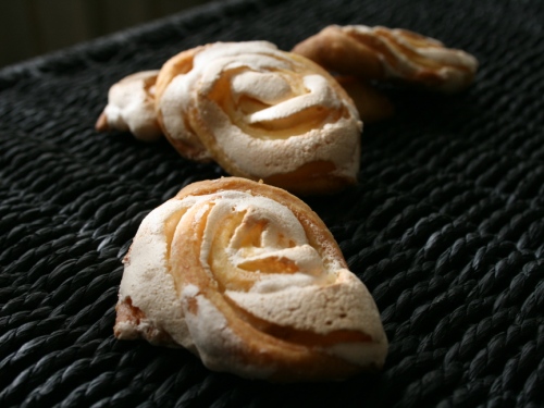 Делим тесто на 2 части. Раскатываем на рабочей поверхности, присыпанной мукой, лепешку из одной части, довольно тонкую, около 3 мм. Наносим на её поверхность 1/2 белковой массы. Сворачиваем в рулет. Режем на кусочки толщиной 1–1,5 см. Укладываем на противень («рулетиковую» частью наверх) и отправляем в духовку, заранее разогретую до 180С на 20 минут до золотистой корочки.
