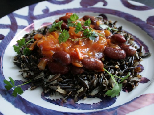 Просто тушим на маленьком огне в оливковом масле лук, затем добавляем морковь. Как только они станут мягкими, кладем фасоль. Еще немного потомим на огне. Солим, перчим. Подаем с рисом и зеленью.