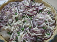 Вынимаем форму с тестом из холодильника. Выкладываем в неё и распределяем равномерно судак, затем сыр, лук и горошек с зеленью.