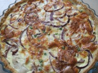В казанке разогреваем масло и слегка притушим в нем лук. Снимаем с огня, даем остыть. Я в первый раз положила в киш свежий лук, без обработки, но тонко порезанный, получилось ок, но притушенный он намного мягче и нежнее.