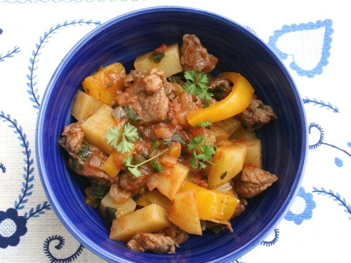 Мясо порезать на небольшие кусочки и кинуть в казанок с маслом. Начать тушить на небольшом огне. Добавить луко и около 1 чашки кипящей воды, тушить под крышкой. Затем влить вино, положить томаты и продолжить тушение. Когда мясо станет мягким, кладем порезанные перец, сельдерей и картофель. Также кладем лавровый лист и паприку. Тушим до готовности овощей. Солим, перчим, посыпаем свежей зеленью. Снимаем с огня и можно сервировать.