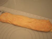 Тесто делим на две равные части. Одну кладем под пленку, с другой начинаем работать. Тесто раскатываем до тончайшего состояния. Кисточкой смазываем растопленным маслом. Раскладываем половину начинки равномерным слоем. Подворачиваем края и закручиваем рулет. Переносим на лист. Опять смазываем поверхность маслом.