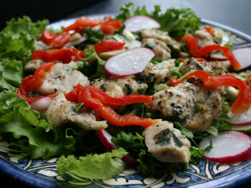 - также в этот салат можно добавить (тогда количество порций увеличится) — 1 авокадо, горсть маслин или оливок, помидорки черри, любую зелень. Я добавила кусочки печеного болгарского перца (запекла перец целиком на противне вместе с грудкой).