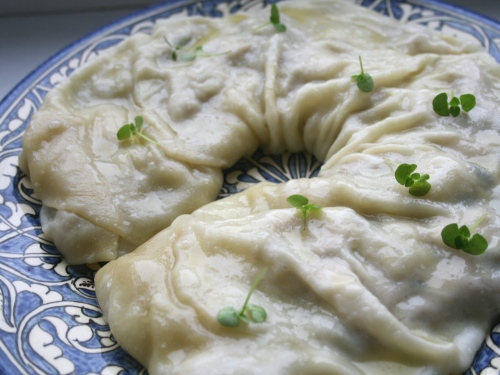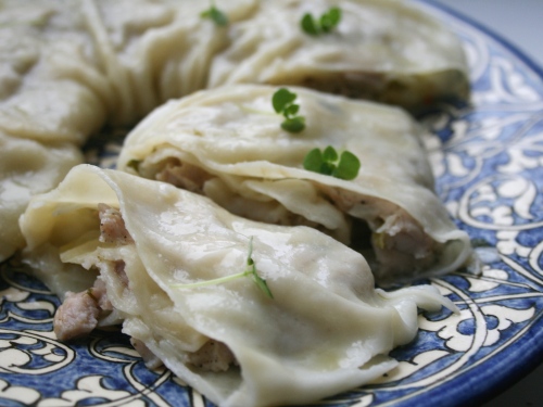 Также формируем второй рулет. Ставим листы на мантоварку с кипящей водой. Готовим 30 минут. Подаем с зеленью и домашними томатными (острыми или нет) соусами.