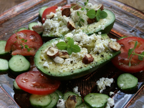 Помидор и огурец режем на тонкие пластики, раскладываем вокруг авокадо. В углубления авокадо раскрошим фету, порезанный фундук. Вы даже не представляете себе, как волшебно сочетается авокадо с орехами!))) Украсим веточками/листиками зелени. Солим, перчим. Поливаем оливковым маслом. К столу!