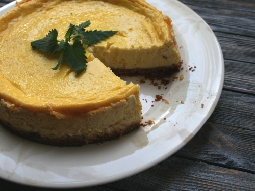 Соединить все составляющие в миске. Взбивать лучше на средней скорости, иначе чизкейк будет сильно подниматься в духовке и после выпечки опадет…Теперь выкладываем начинку на песочную основу и отправляем в духовку на 50 минут — 1 час. Поверхность после выпечки БУДЕТ довольно бледненькой и трясущейся — это нормально.))) Охлаждаем. Подавать можно часа через 4 или лучше на следующий день.