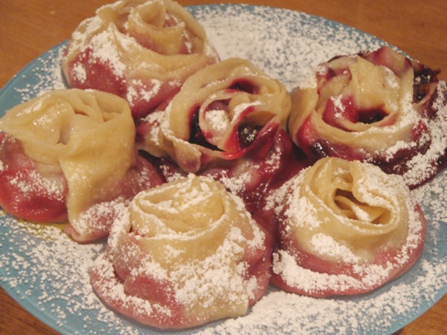 3) Для сладких роз лучше всего подходит вишня. Смородина после пара сильно ядреная, клубника сильно раскисает, хотя тоже получается симпатично. Когда готовлю вишню, то обязательно добавляю чуть сахарной пудры и крахмала, все перемешиваю, потом начиняю, вишню лучше разрезать пополам. Готовые розы заснеживаю сахарной пудрой. Вообще с вишней – это классическое украинское блюдо – вареники с вишней, размером с ладонь, так делают в деревнях. Но а этот вариант с розами более изящный, но вкус от этого не меняется.