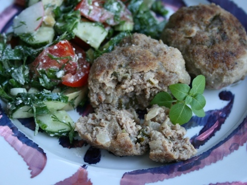 Тщательно смешиваем все компоненты (лучше руками проминаем до однородности). Куриный фарш более влажный (можно использовать меньше сметаны). Формируем небольшие котлеты.