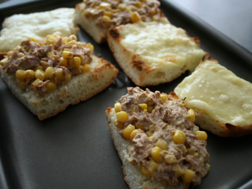 Смешиваем, разминаем вилкой кукурузу с тунцом, сметаной и горчицой. Солим и перчим. Намазываем бутерброды (как на фото ниже: на один кусочек начинку, на другой сыр) и отправляем в заранее разогретую духовку, ближе к верху, чтобы бутерброд подпекся- начинка прогрелась, а сыр расплавился. Соединяем половинки.