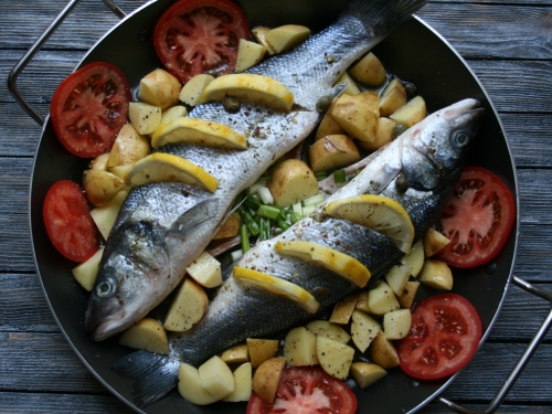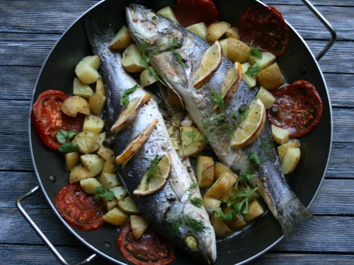 Только теперь в главной роли сибас. Который можно оригинальным образом подготовить к запеканию — сделать небольшие надрезы и вставить в них тонкие ломтики лимона. Предварительно я натерла рыбу смесью из раздавленного чеснока, оливкового масла, соли, перца и трав. Внутрь рыбины помещаем лавровый лист.