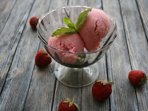 Ягоды взбить в блендере и протереть через сито. Смешать с йогуртом. Перелить в емкость для замораживания. Взбивать каждые 40 минут (4–5 раз), как только масса начнет схватываться. Процесс муторный, но другого пути нет. Только аггрегат для приготовления мороженого в домашних условиях может помочь.)))