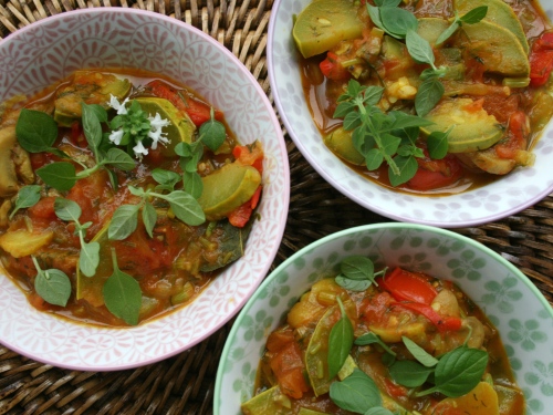 В горячее масло бросаем чили, лавровый лист и чеснок. Немного позже куркуму. Затем лук. Далее начинаем тушить грибы. В это время режем красный перец, кабачки и помидоры. Закидываем и тушим до готовности, мягкости овощей. Солим и перчим. Щедро сдабриваем зеленью.
