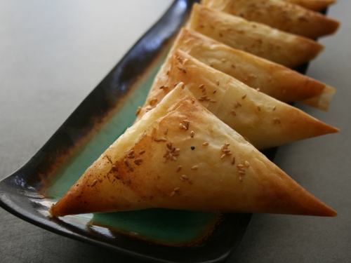 Полоску теста смазываем тонким слоем растопленного масла, кладем чайную ложку брынзы и заворачиваем треугольником. Сверху еще раз смазываем маслом и посыпаем кунжутом. Так со всеми 12 -ти. Выкладываем на противень и отправляем в духовку, разогретую до 180С. Печем до золотистого оттенка, около 15 минут. Подаем в теплом виде!