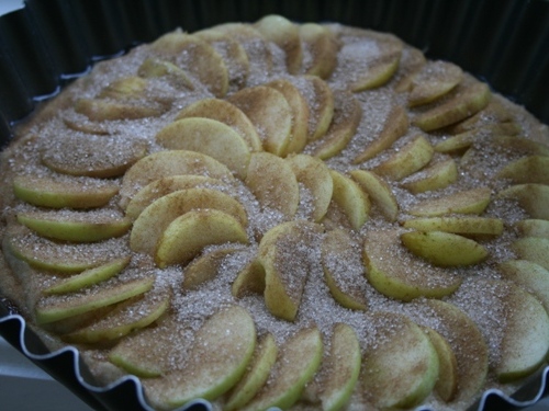 Яблоки очищаем от кожицы (если она жесткая) и сердцевины. Режем на пластинки около 2–3 мм толщиной и выкладываем на поверхности теста. Посыпаем смесью корицы и сахара.