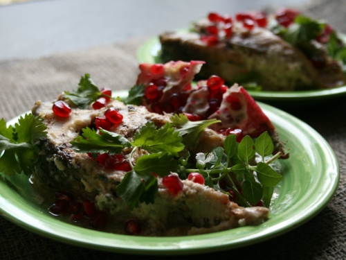 Подаем с зеленью, свежим лимоном. На моих зеленых тарелках готовую рыбу украсила «гранатовая россыпь».