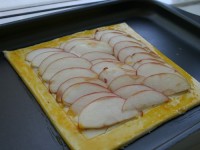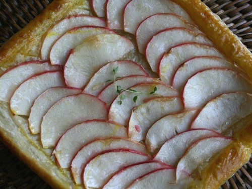 На фото снизу — яблочный пирог. Два яблока очень тонко порезать на пластинки, выложить аккуратненько на тесто, как раз там, где вы отметили ножом решеточку. Края смазываем желтком и печем.