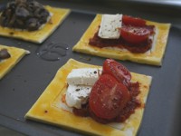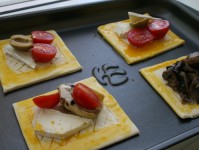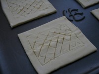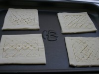 2) Разворачиваем тесто и режем на квадраты размером около 10 х 10 см. РАСКАТЫВАТЬ ТЕСТО НЕ ТРЕБУЕТСЯ! Из каждого квадратика нужно сделать «рамочку» — с помощью острого ножа надрезаем, но не до конца бортики, серединку отмечаем решеткой.
