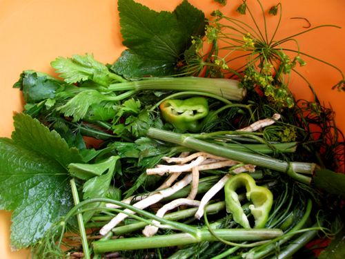 Бланширую укроп, сельдерей, разноцветный болгарский перец и немного стручкового полугорького, корешки хрена, зубчики чеснока, листочки смородины и вишни (если раздобудете – я раздобыла!). Одновременно получаю противопростудные ингаляции эфирными маслами вышеозначенных продуктов.