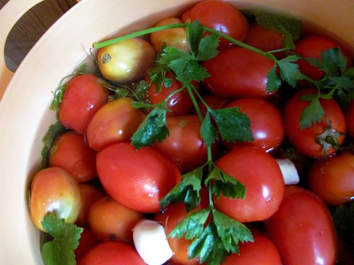 На эту зеленую подушку кладу помидоры – «фейс-контроль» можно немного ослабить, подойдут и не совсем безупречные плоды. Не лишним будет чередовать слои томатов с зеленью и кореньями.