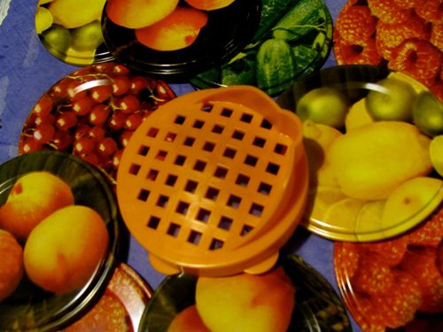 Параллельно в большой емкости кипячу воду, заливаю ею наполненную томатами банку, накрываю крышкой и держу 3–5 минут. Из всего арсенала крышек сейчас понадобится решетчатая пластиковая с носиком для слива.
