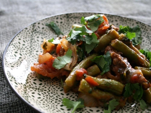 Мясо порезать на небольшие кусочки и кинуть в казанок с маслом. Начать тушить на небольшом огне. Добавить лук и около 1 чашки кипящей воды, тушить под крышкой. Затем положить томаты и продолжить тушение. Когда мясо станет мягким, кладем порезанные пополам стручки фасоли. Также кладем лавровый лист, чеснок и паприку. Тушим до мягкости фасоли (лучше слегка недотушить, чтобы она была зеленой!). Солим, перчим, посыпаем свежей зеленью. Снимаем с огня и можно сервировать.