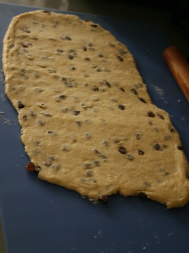 В теплом молоке разводим дрожжи. В отдельной миске смешиваем яйца, растопленное сливочное масло, сахар, ваниль и имбирь. Вводим дрожжи. Постепенно добавляем муку. Затем изюм. Готовое тесто оставляем на 2 часа в теплом месте, чтобы хорошо подошло.