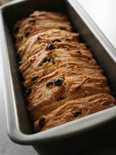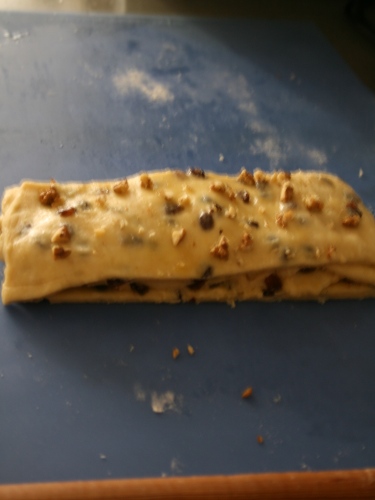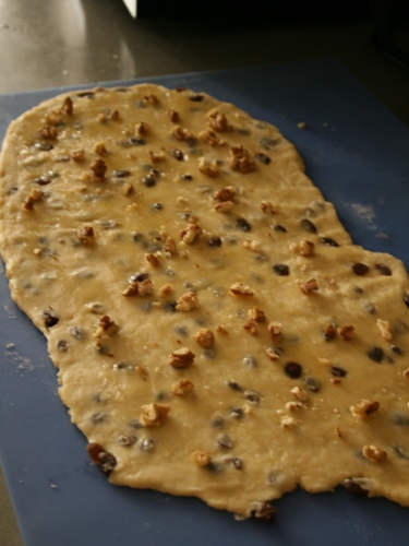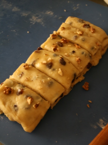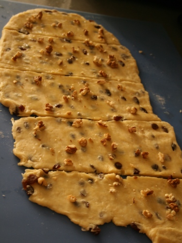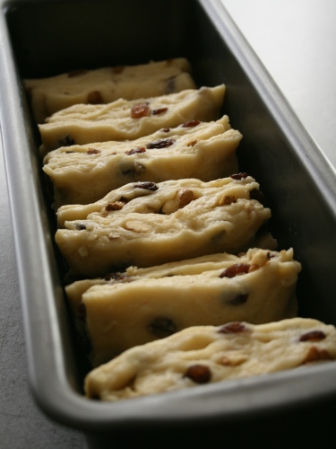 Как только тесто подойдет, раскатать прямоугольный пласт 50 см х 25 см. Разрезать по ширине на 5 частей. Смазать маслом, посыпать орехами. Сложить пласты теста друг на друга и вновь порезать, теперь уже на 6 частей. Уложить в форму кирпичик (форму обязательно слегка смазать маслом), срезом наверх. Дать кусочкам рулета еще раз подойти и увеличиться в объеме. Время — около 45–60 минут, под пленкой.