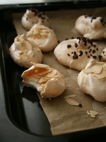 В белки добавила несколько капель миндальной эссенции. На противень выкладывала порции по 1 ст. л. Сверху посыпала миндальными лепестками или какао-бобами рубленными (но их сложно найти у нас).