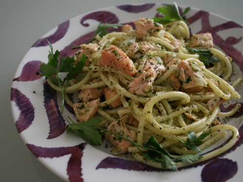Разогреваем масло в казанке с толстыми стенками, добавляем лук, слегка потомим на маленьком огне. Затем кидаем кусочки семги. Постоянно помешиваем, семга будет готова в течении нескольких минут – кусочки станут нежно бледно розовые. Теперь кладем песто (я использовала примерно 2/3 количества приготовленного выше, так как часть ушла на закуски. Но чем больше песто вы используете, тем насыщеннее и ярче будет соус).
